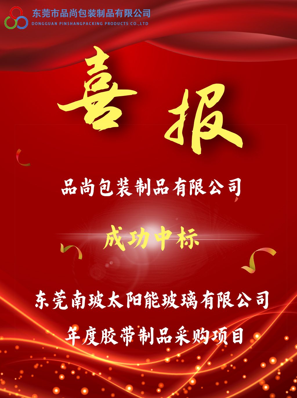 近日,品尚包裝憑借的技術實力、豐富的行業經驗及優質的服務方案,成功中標中國南玻集團——東莞南玻太陽能玻璃有限公司,年度膠帶采購業務。此次中標是對公司綜合競爭力的高度認可,也為雙方合作奠定了堅實基礎。公司將以此次中標為契機,嚴格按照項目要求,高標準、高質量完成交付,為客戶創造更大價值!